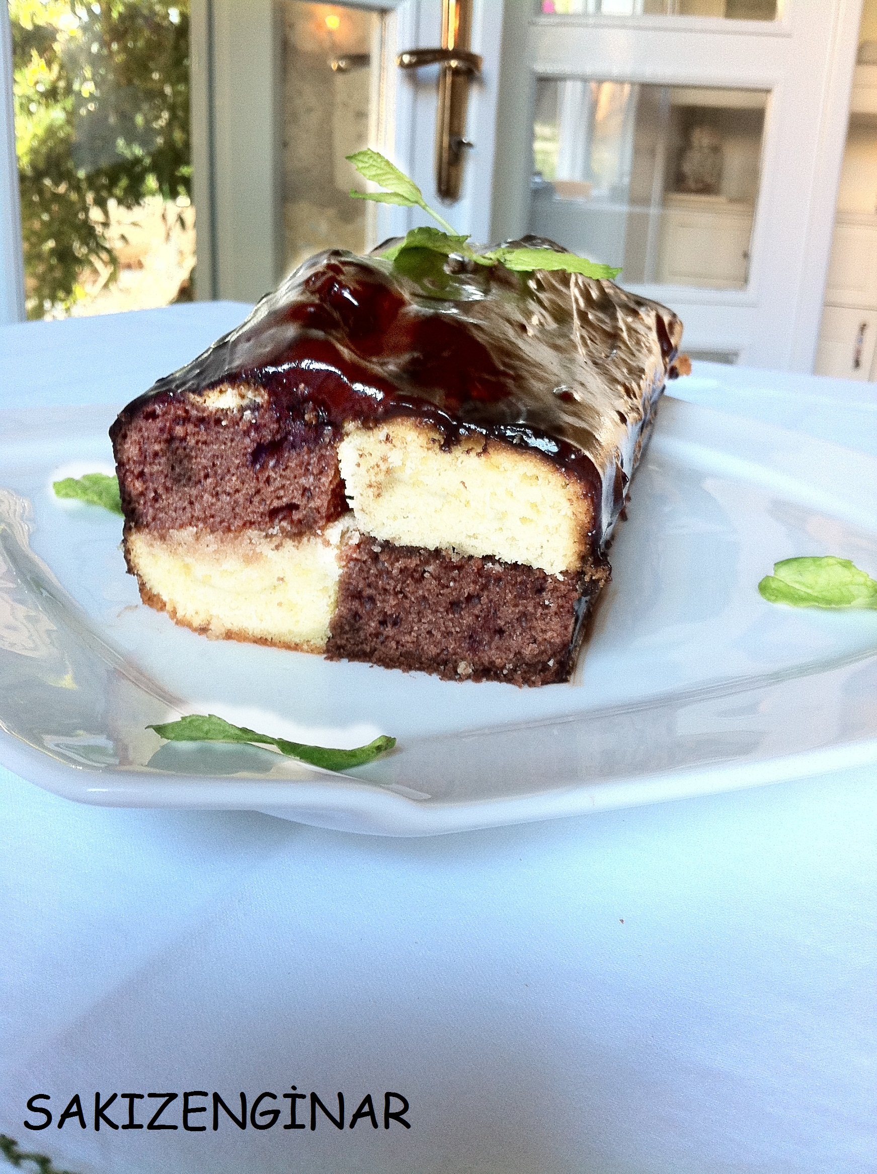 Sade ve kakaolu birer kek dilimini yan yana getirip üzerine bal sürün. Diğer kek dilimlerini de ters şekilde yerleştirin. Üzerine ve yanlarına bal sürerek parçaların birbirine yapışmasını sağlayın.