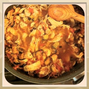 Domateslerin kabuklarını soyun  küp şeklinde doğrayın tavuk suyunun içine alın. Domatesler pişmeye başlayınca kızarmış patlıcanları ve tavuğu ve ezilmiş sarımsağı ekleyin  5 dakika daha  kaynatın .