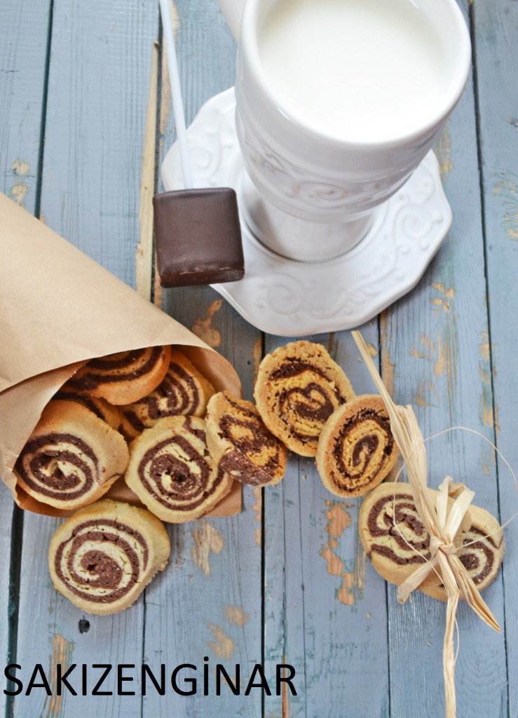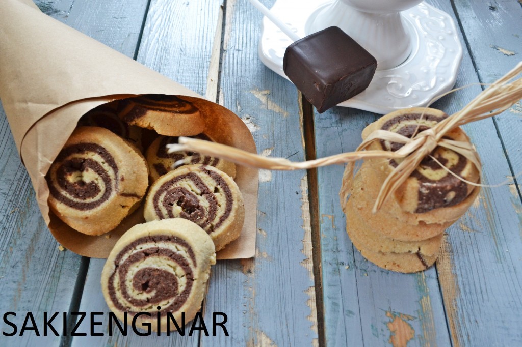 Hamurları unlanmış mutfak tezgahında açın, çikolatalı hamurun üzerine fırça ile yumurta akı sürüp vanilyalı hamuru yerleştirin. Rulo şeklinde sarıp buzdolabında 1 saat bekletin. Dinlenen hamuru dilimleyip tepsiye dizin,180 drece fırında 15-20 dakika pişirin.