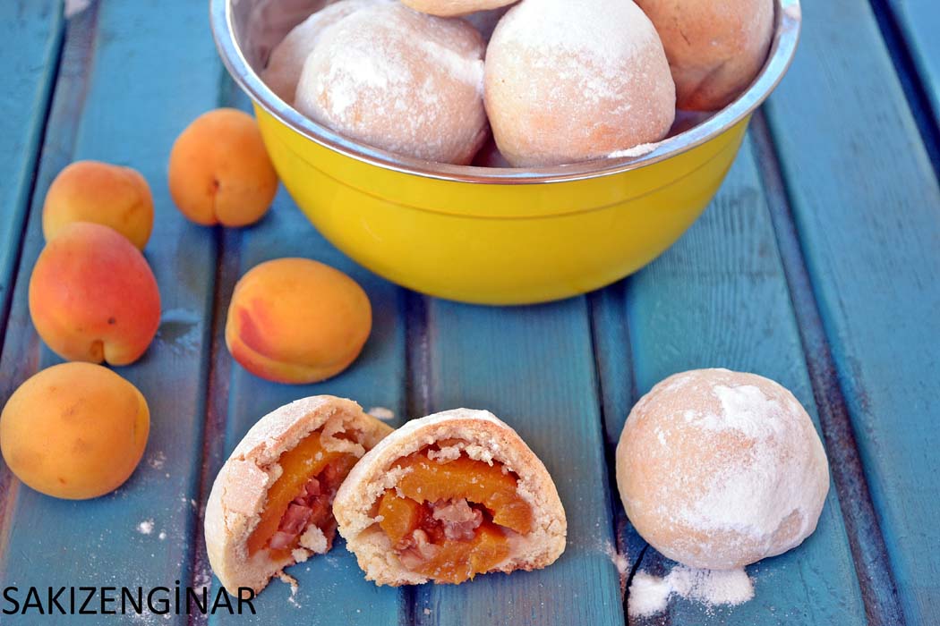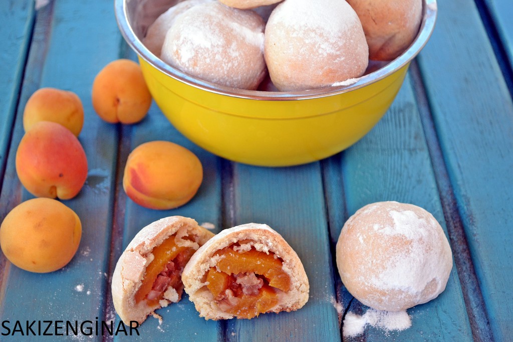 Hamurdan mandalina büyüklüğünde parçalar kopartın. Elinizle yuvarlayıp ortasını oyun, doldurulmuş kayısıları yerleştirin. Avucunuzun içinde tekrar yuvarlayıp yağlı kağıt serdiğiniz fırın tepsisine yerleştirin.