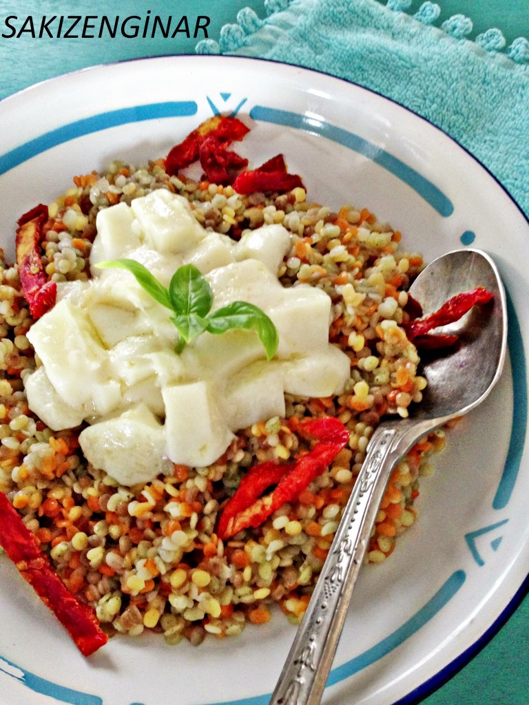 Pilav tenceresine tereyağını ve zeytin yağını ekleyin, yağ ısınmaya başlayınca kuru domatesleri ekleyip hafif soteleyin. Kuskus makarnayı ,üzerine sıcak su ve tuzu ekleyip kısık ateşte suyunu çekinceye kadar pişirin. Sıcakken üzerine küp şeklinde doğranmış peynirleri yerleştirip üstünü bir kağıt havlu ile örtün demlenmeye bırakın.