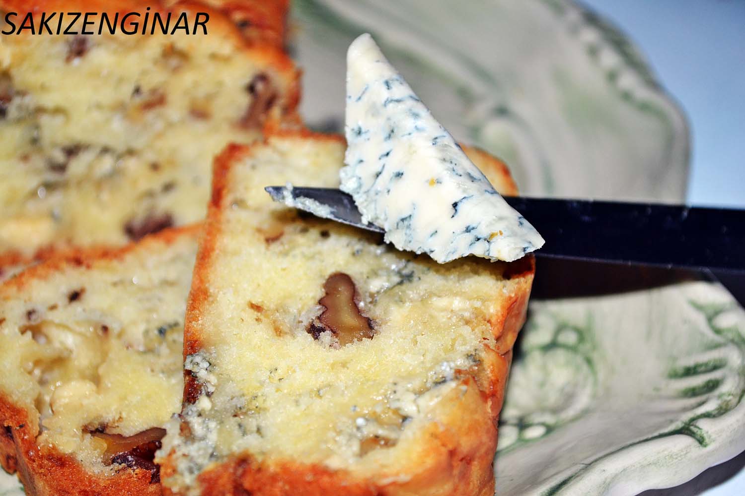 Rokfor peynirini çatalla parçalayıp ceviz içi ile karıştırın. Kek hamurunun içine ilave edip tahta kaşıkla karıştırın.