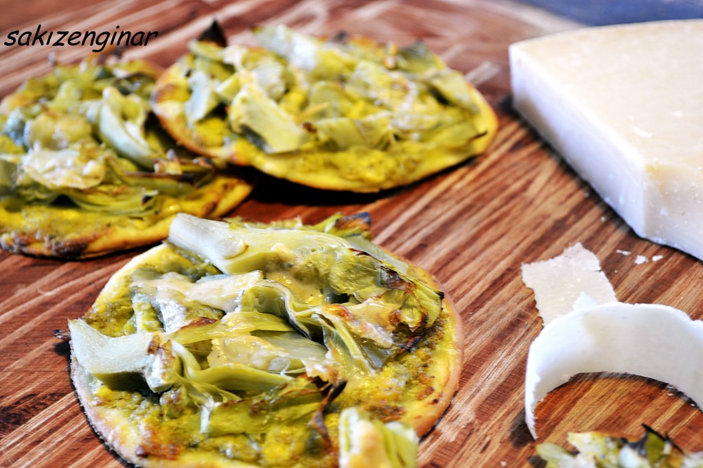- Limonlu suda haşladığınız enginarları ince dilimleyin. Pizzanın üzerine yerleştirin. Parmesan peynirini sebze soyucusu ile ince ince kesin, enginarların üzerine koyun. Tuz ve karabiber serpin.