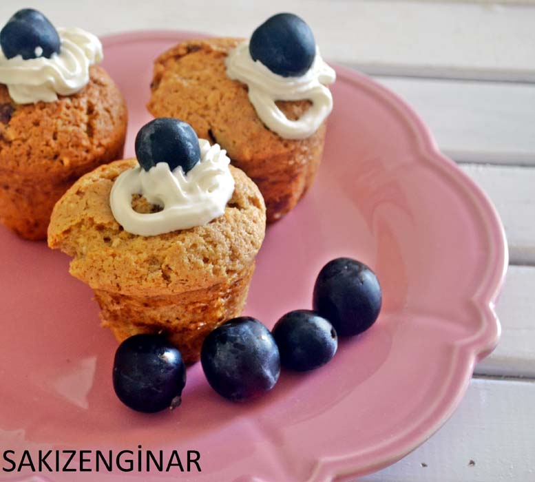 Muffinler soğuduktan sonra üzerlerine krema sıkıp mevsim meyveleri ile süsleyerek servis edin.
